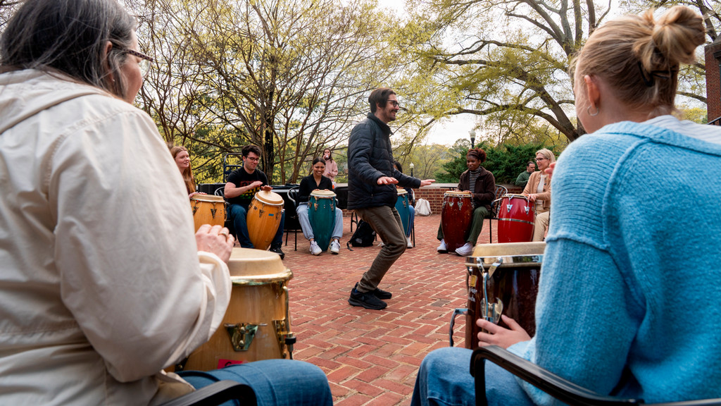 People on campus participate in a drum circle outside.